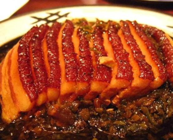 五花肉500克、芽菜或黴乾菜200克、老抽2克、醬油15ml、花椒20粒、料酒10ml、糖5ml、大蔥一根、姜10片、油適量。